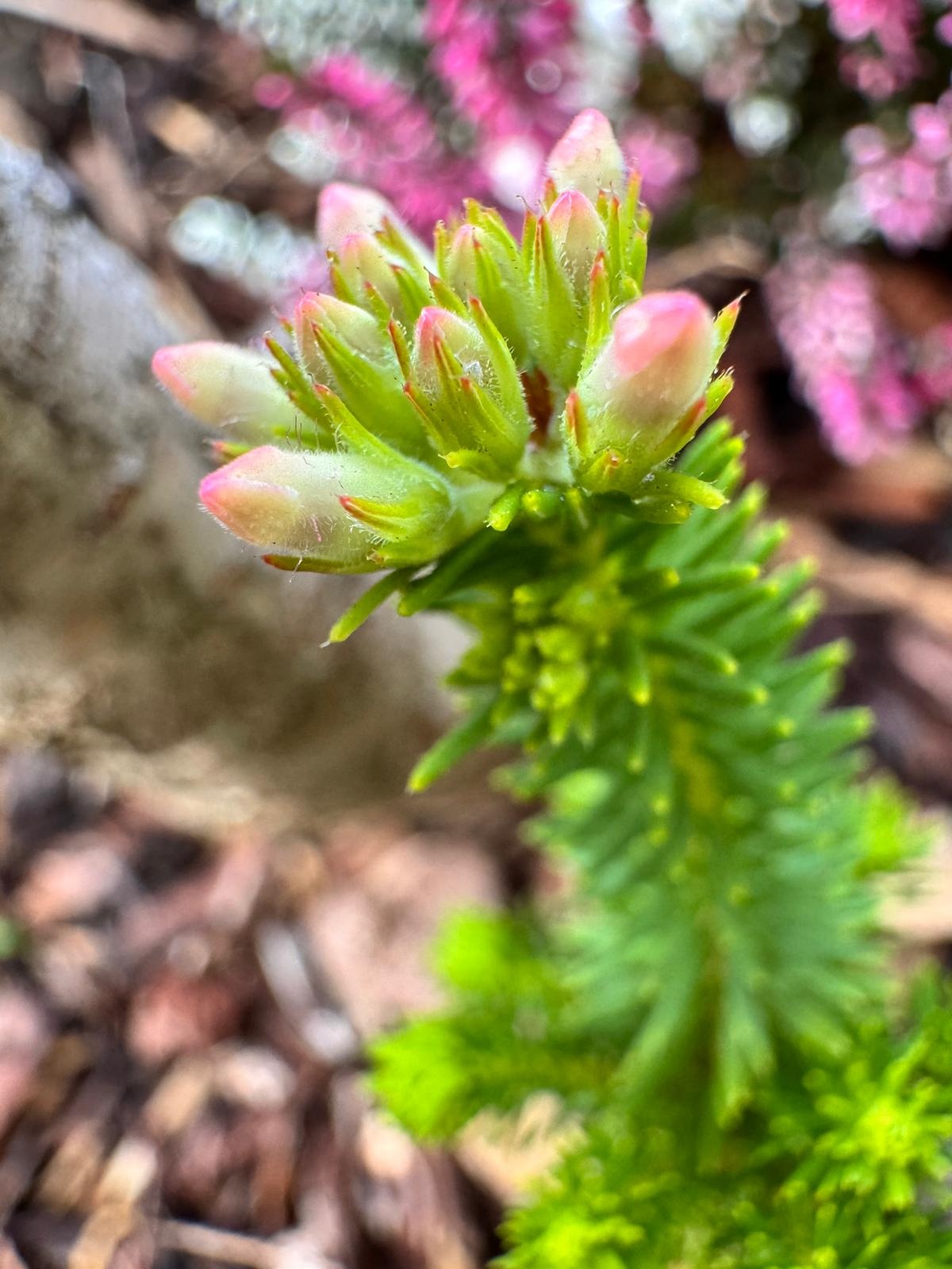De 'Afrikaanse' heide heeft lange, roze trosvormige bloemen. De bladeren groeien kransvormig.