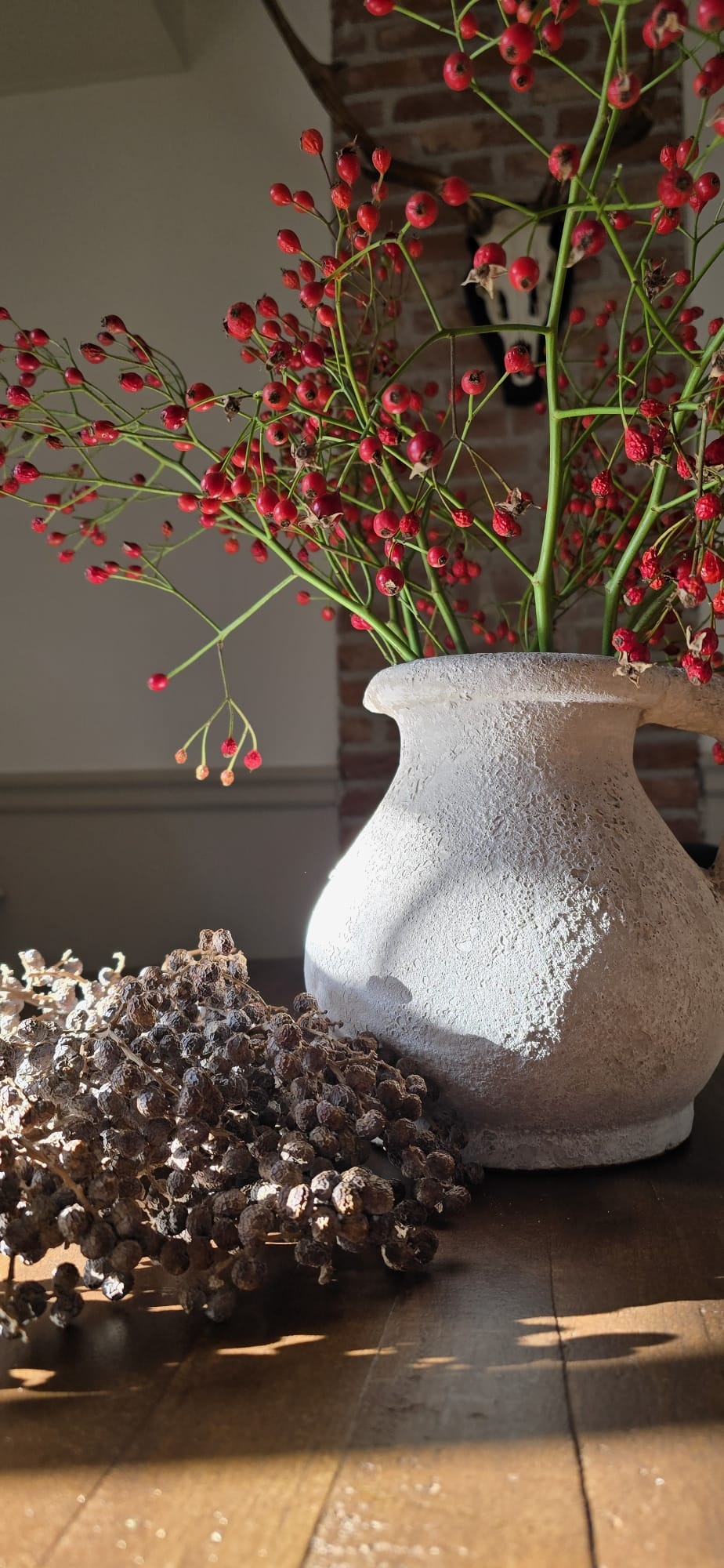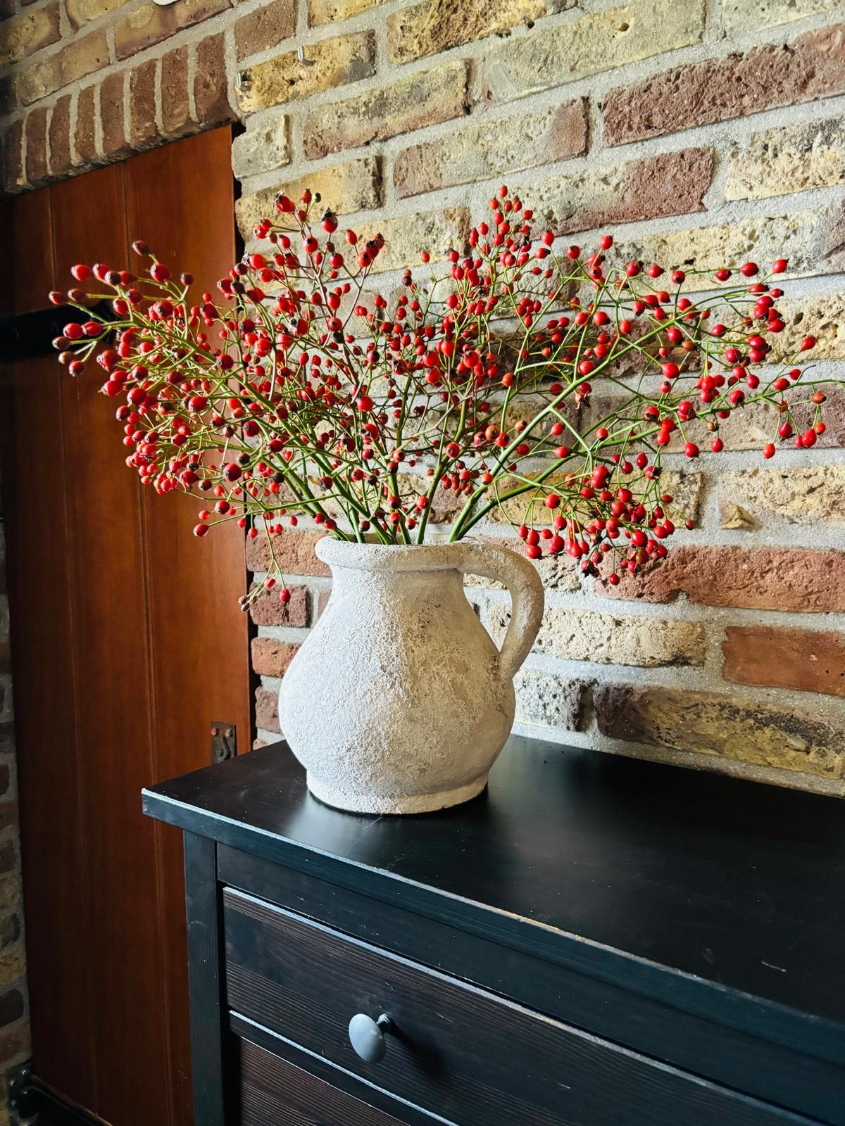 Wil je een bredere bos? Neem dan meerdere bossen van dezelfde maat. Meng takken met rode en takken met oranje bessen voor een extra kleurrijk effect! Wil je liever een vollere bos? Combineer dan bossen van verschillende maten. Op de foto met de zwarte vaas zijn twee bossen gebruikt: 50 en 60 cm lengte met rode bes.