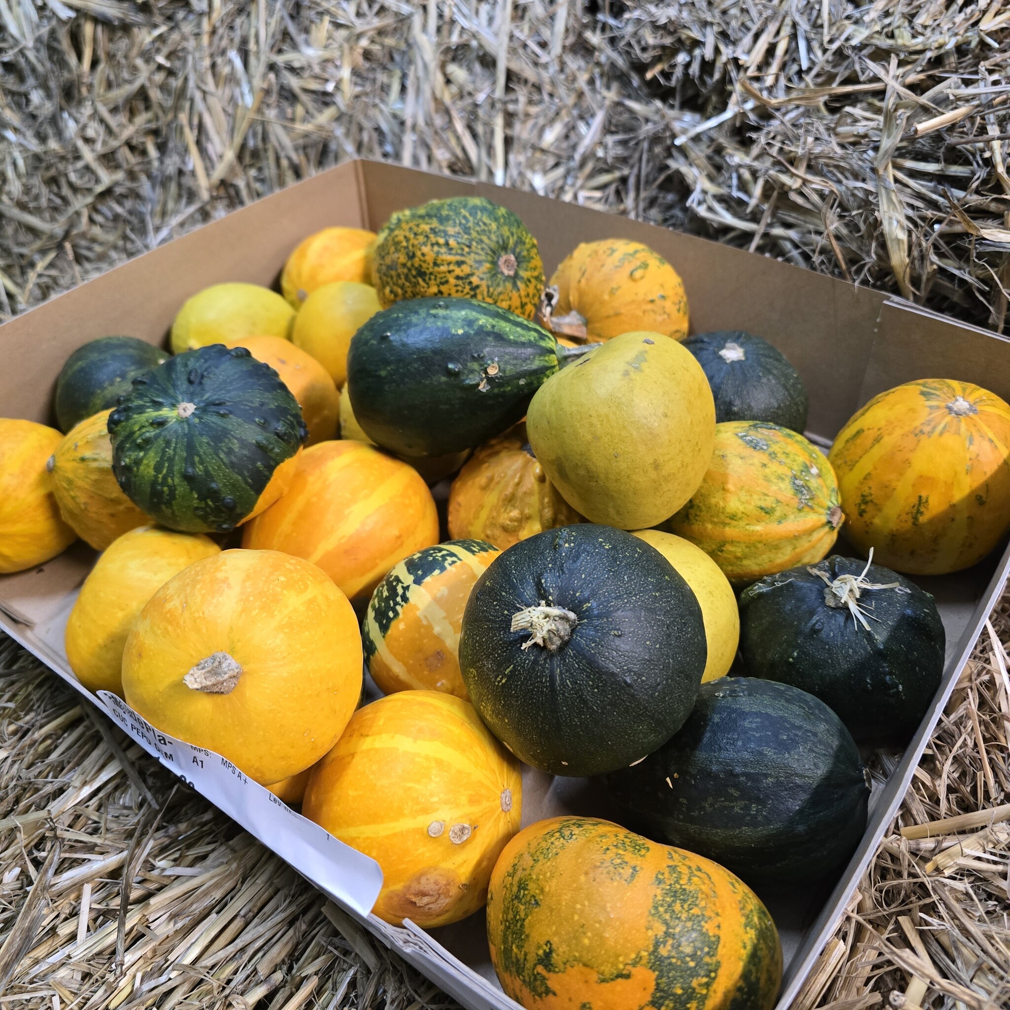 Sierkalebassen 5 stuks. De sierpompoenen verschillen van uiterlijk en kleur en worden gevarieerd geleverd. Niet voor consumptie.